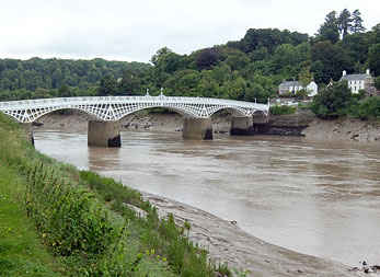 Eine Schönheit britischer Ingenieurskunst: die gußeiserne Brücke über den River Wye, frühes 19. Jahrhundert. Genau in der Brückenmitte verläuft die Grenze zwischen der walisischen Grafschaft Monmouth und dem englischen Gloucestershire. Der River Wye ist gezeitenabhängig, gerade herrscht Ebbe. Beim Thema Cider ist man zu beiden Ufern immer flüssig.